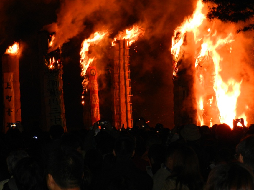 され、勇壮な火祭りは松明太鼓の演奏とともに最高潮に達した。巨大な火柱は雨がやんだ晩秋の夜空を赤々と焦がし、県内外から訪れた大勢の観光客を魅了した。