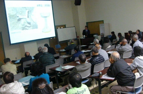 押山さんは約100人の考古学ファンを前に、清水台遺跡(安積郡役所)や郡山台遺跡(安達郡役所)、田村地方の寺社とのかかわりも含めてわかりやすく説明した。
