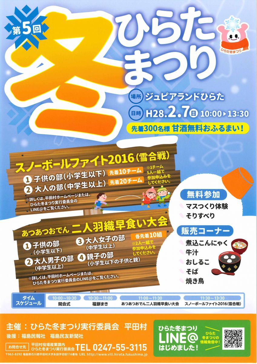 平田村の「第5回ひらた冬まつり」は2月7日、同村のジュピアランドひらたで開く。