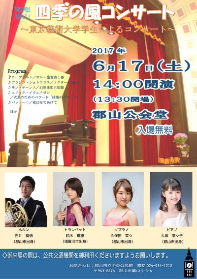 郡山市ゆかりの若手音楽家たちを発掘、育成する「四季の風コンサート」は6月17日、郡山市公会堂で開く。