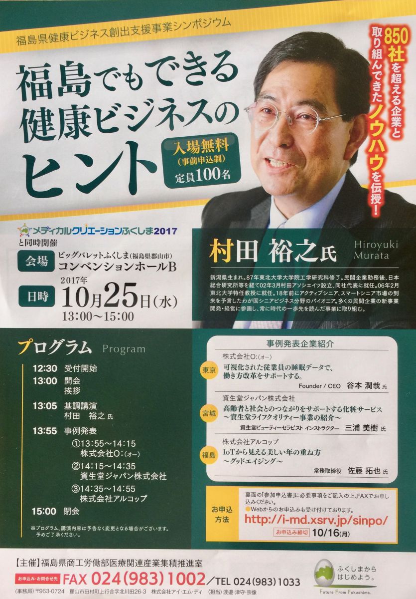 福島県健康ビジネス創出支援事業シンポジウムは10月25日、郡山市のビッグパレットふくしまで開く。入場無料。定員100人。事前に申し込む。福島県商工労働部医療関連産業集積推進室の主催。