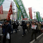 横断幕を掲げ、郡山市内を行進する呼びかけ人